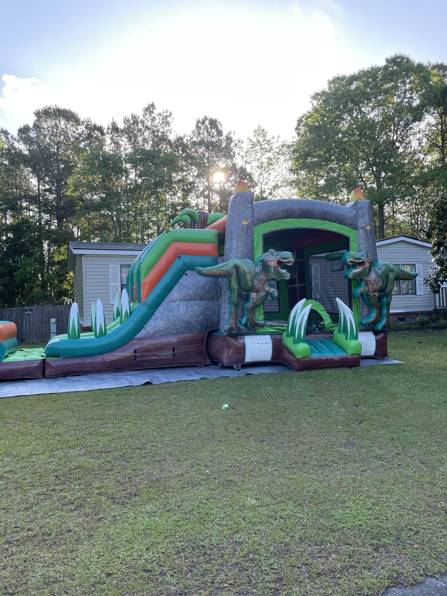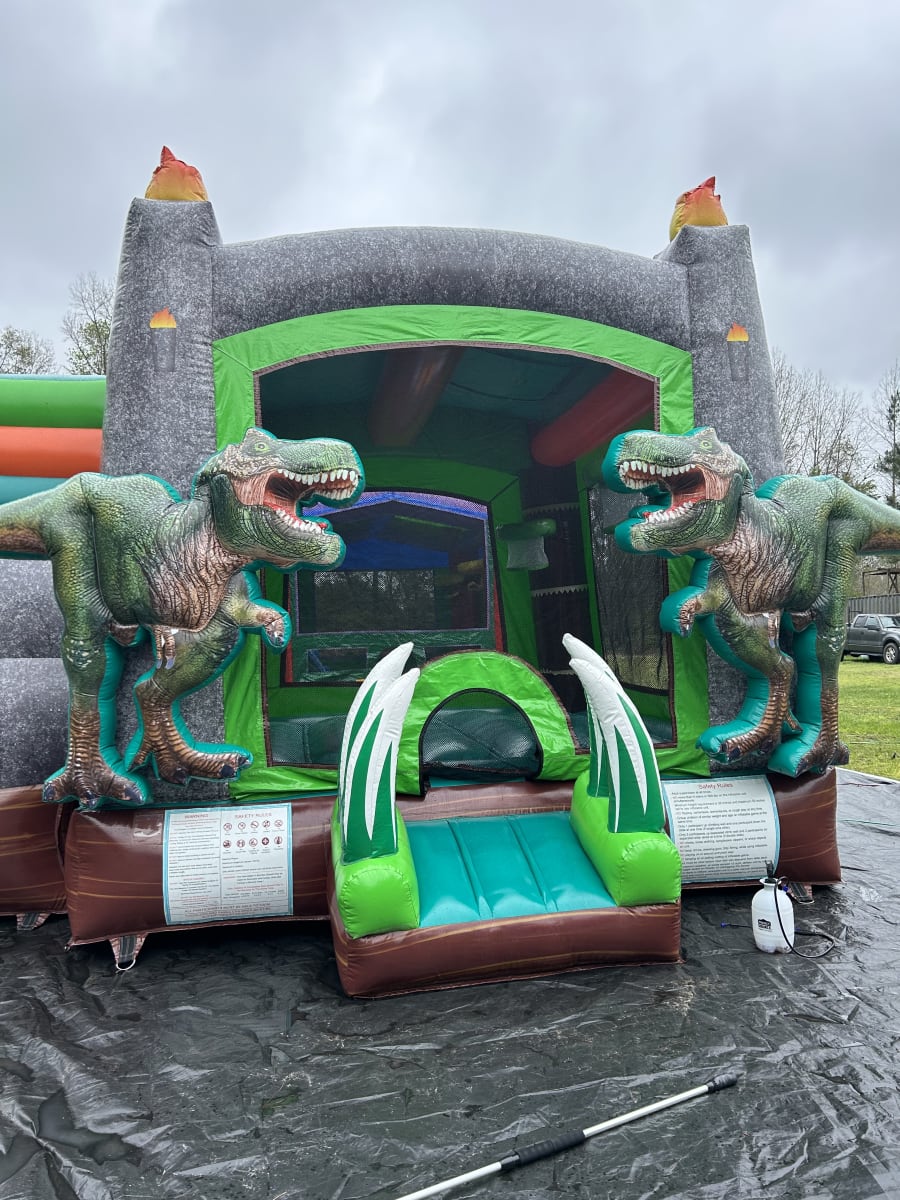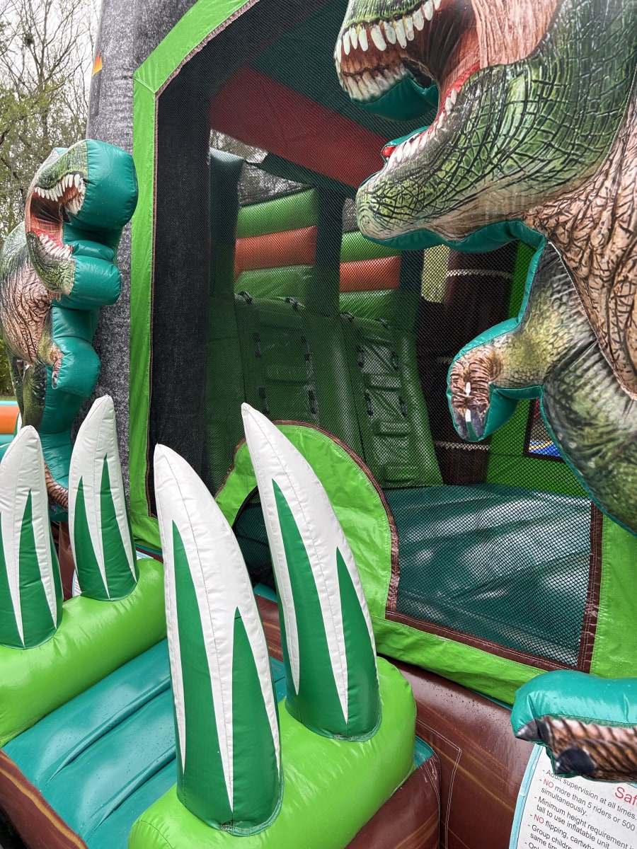 Dare to pass through the dinosaur claws at the entryway of the bounce house! Jump, play & shoot hoops before climbing to the slide where you glide down between even more claws! The detailed design will have your kids RAWRING for more!
