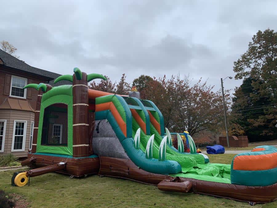 This combo has a large bounce pad with two basketball hoops and a dual lane slide and bumper for a wet or dry rental.
