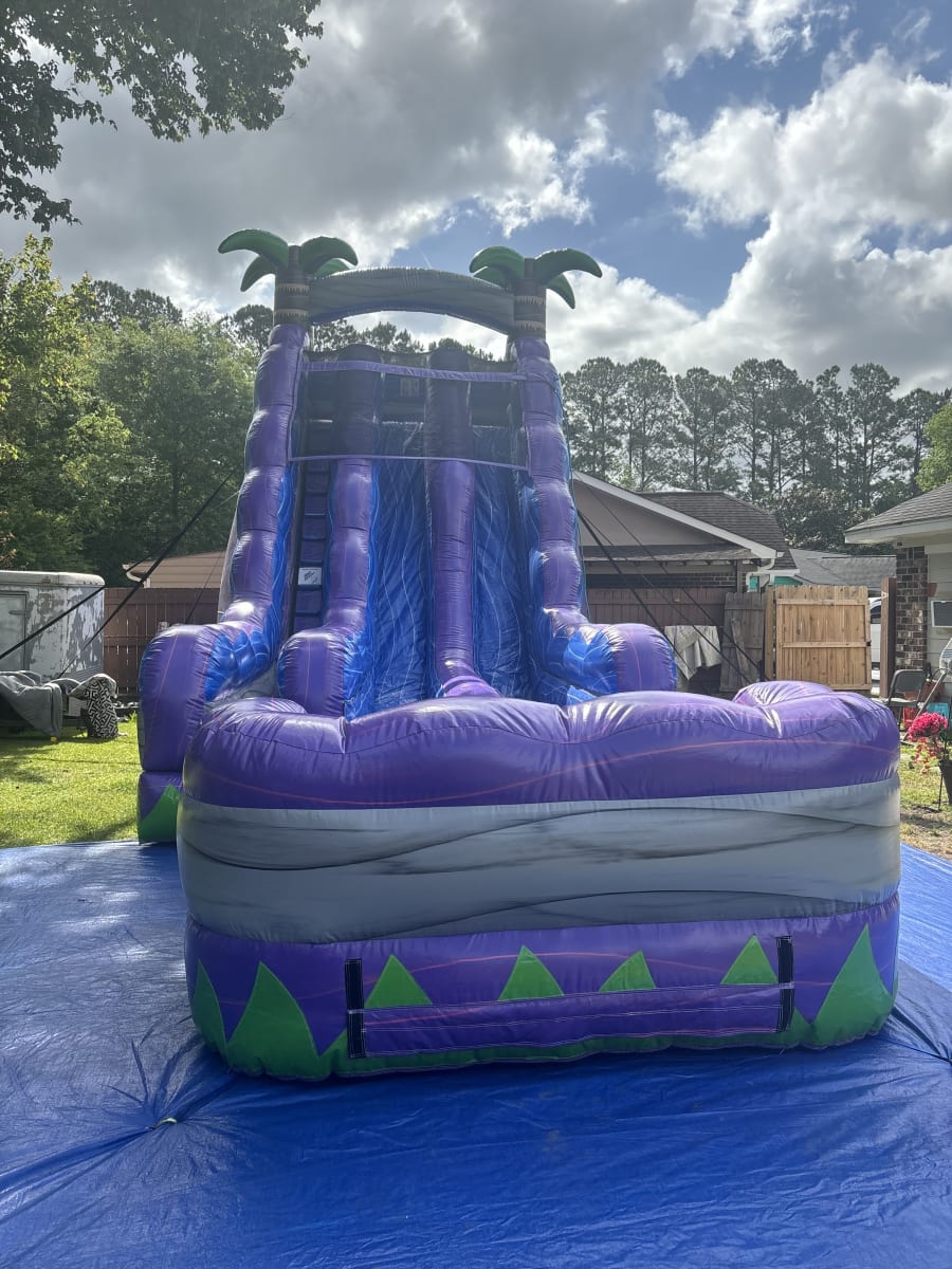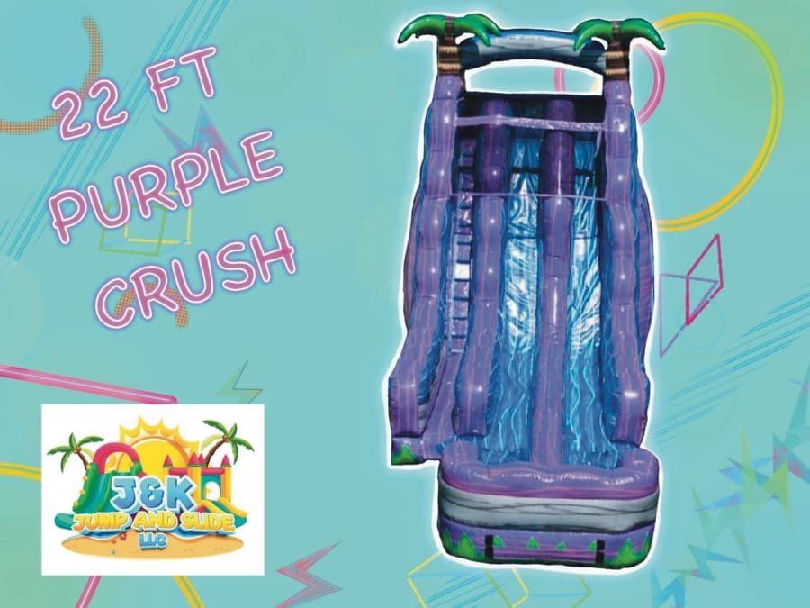 The 22ft Purple Crush Dual Lane is the perfect water slide rental for any summer event. It stands 22 feet tall, and offers a wild ride with plenty of thrills and excitement to keep your guests entertained. The 22ft Purple Crush also features a inflated landing at the end of the slides – ensuring plenty of fun for everyone involved! With its bright Purple and tropical colors, it’s sure to be the hit of any summer event. So consider renting 22ft Purple Crush and make your party an unforgettable experience!